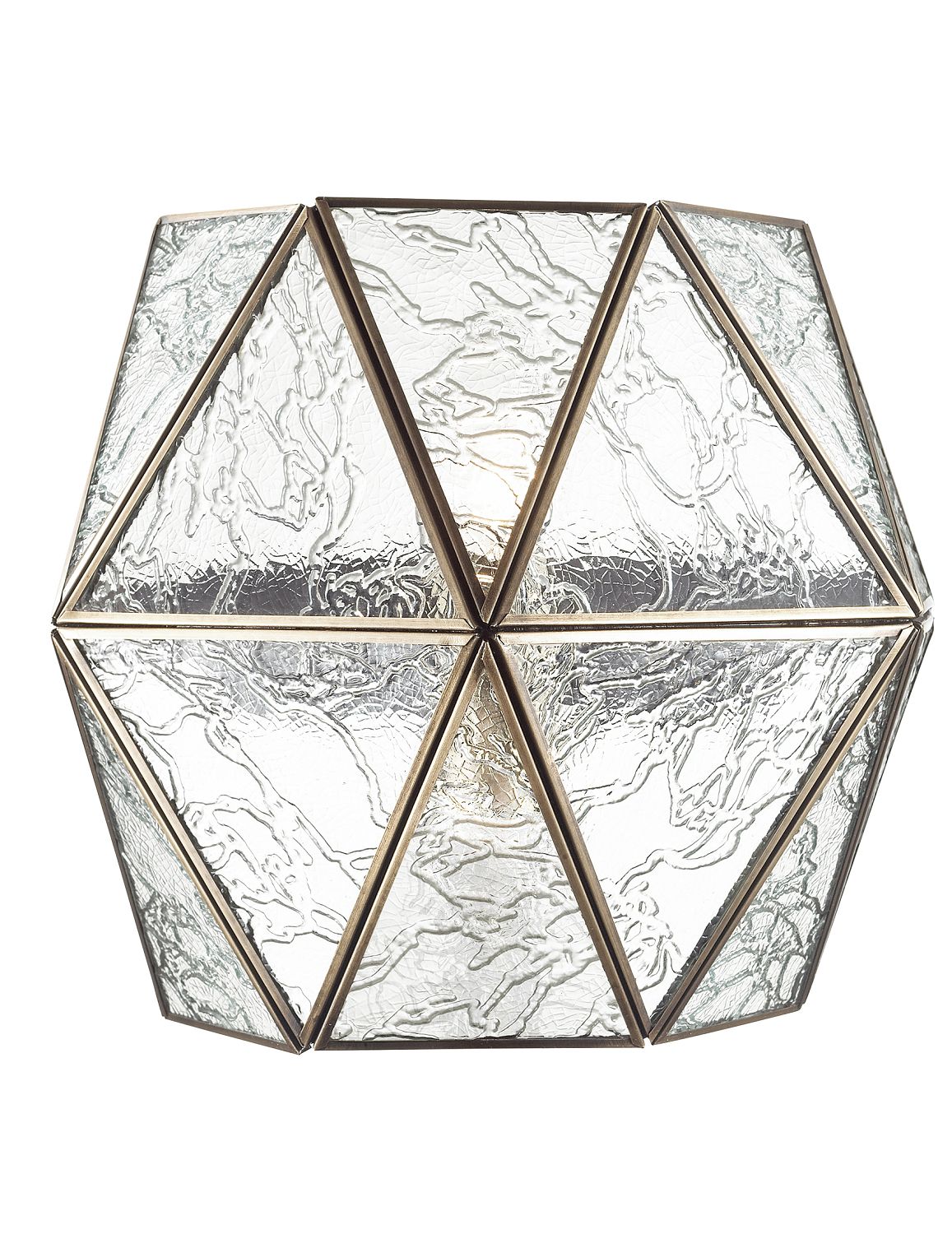 Каркас цвета античной латуни, плафон – из прозрачного стекла с эффектом льда. В данной коллекции используется сложная технология запаивания кусочков стекла в металлический каркас.