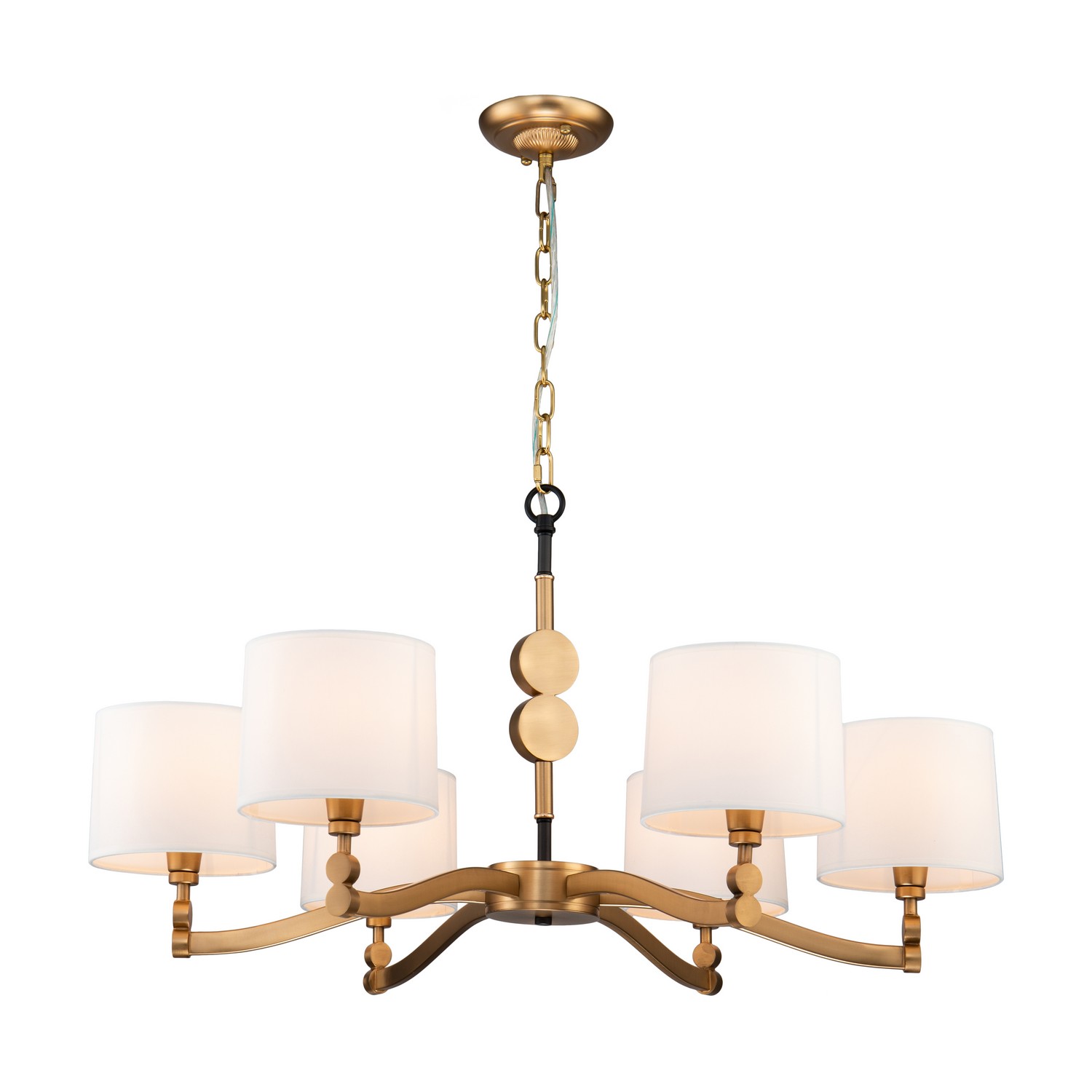 Коллекция Roshe предлагает широкий выбор модификаций. Каркас окрашен в два цвета черный и матовая латунь. Плафоны выполнены из белой ткани. Интересным дизайнерским решением стал декор в виде двойного диска на рожках и центральном штоке светильников.