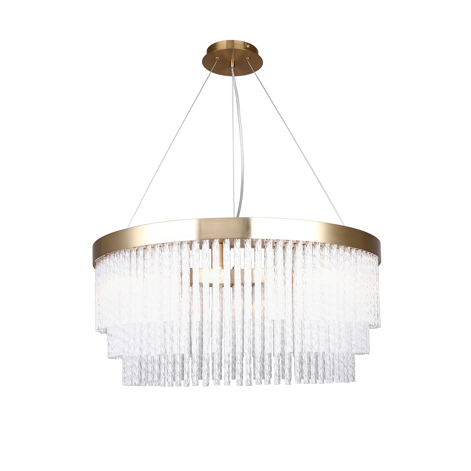 Коллекция Bellinda выполнена в стиле американской классики. Каскадная конструкция состоит из закрученных вокруг своей оси стеклянных трубочек. Этот декор скрывает лампы и мягко пропускает свет. Цвет латуни придает люстрам изысканный вид. Крепление на струнах позволяет регулировать высоту подвеса.