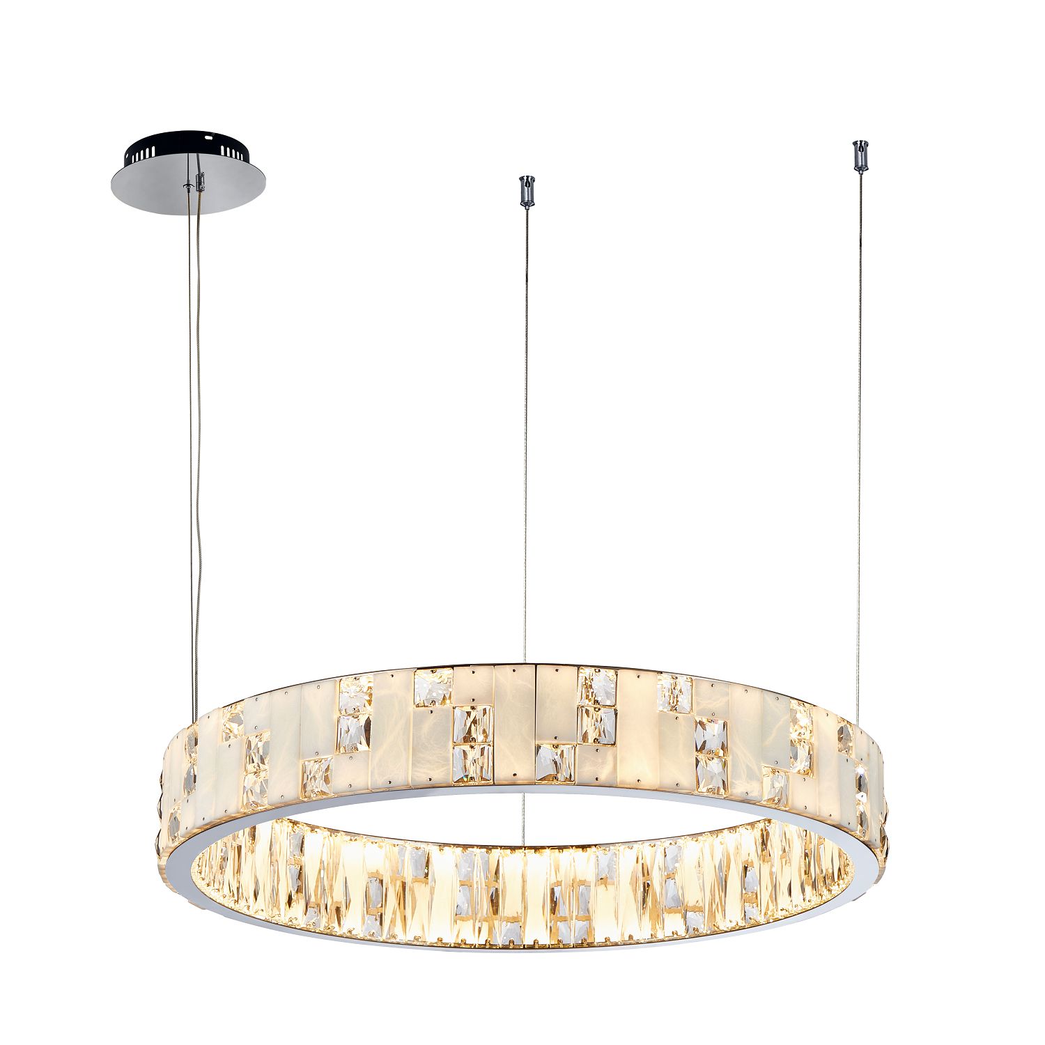 Конструкция люстр в виде колец на тросовых подвесах добавит в интерьер особый шарм и легкость. Хромированная отделка придает этим светильникам современный вид и отражает свет, создавая игру бликов и отражений. Декор в виде тонких пластин из белого мрамора придает изысканный и шикарный вид, особый блеск и нежность. Прозрачные вставки из хрусталя добавляют дополнительную яркость и контрастность. Люстры из этой коллекции создают изумительное освещение и станут прекрасным украшением вашего интерьера. Они идеально впишутся в современный дизайн гостиной, столовой или спальни.