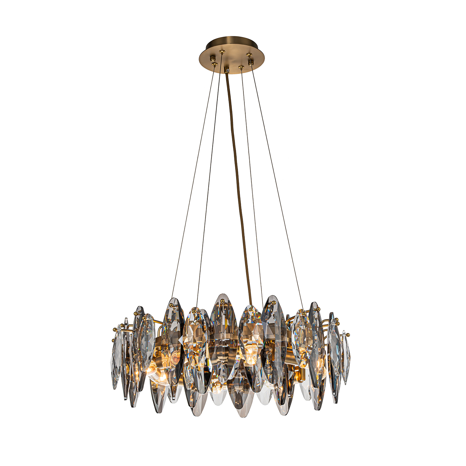 Glans – элегантная кольцевая коллекция, в которой используется прозрачный и серебристодымчатый хрусталь в ритмичном чередовании. Металлическая арматура светильника скрыта за хрустальными лепестками, создавая ощущение легкости и невесомости. К этой серии подходят универсальные крепления, с помощью которых можно создать кольцевые композиции из нескольких люстр.