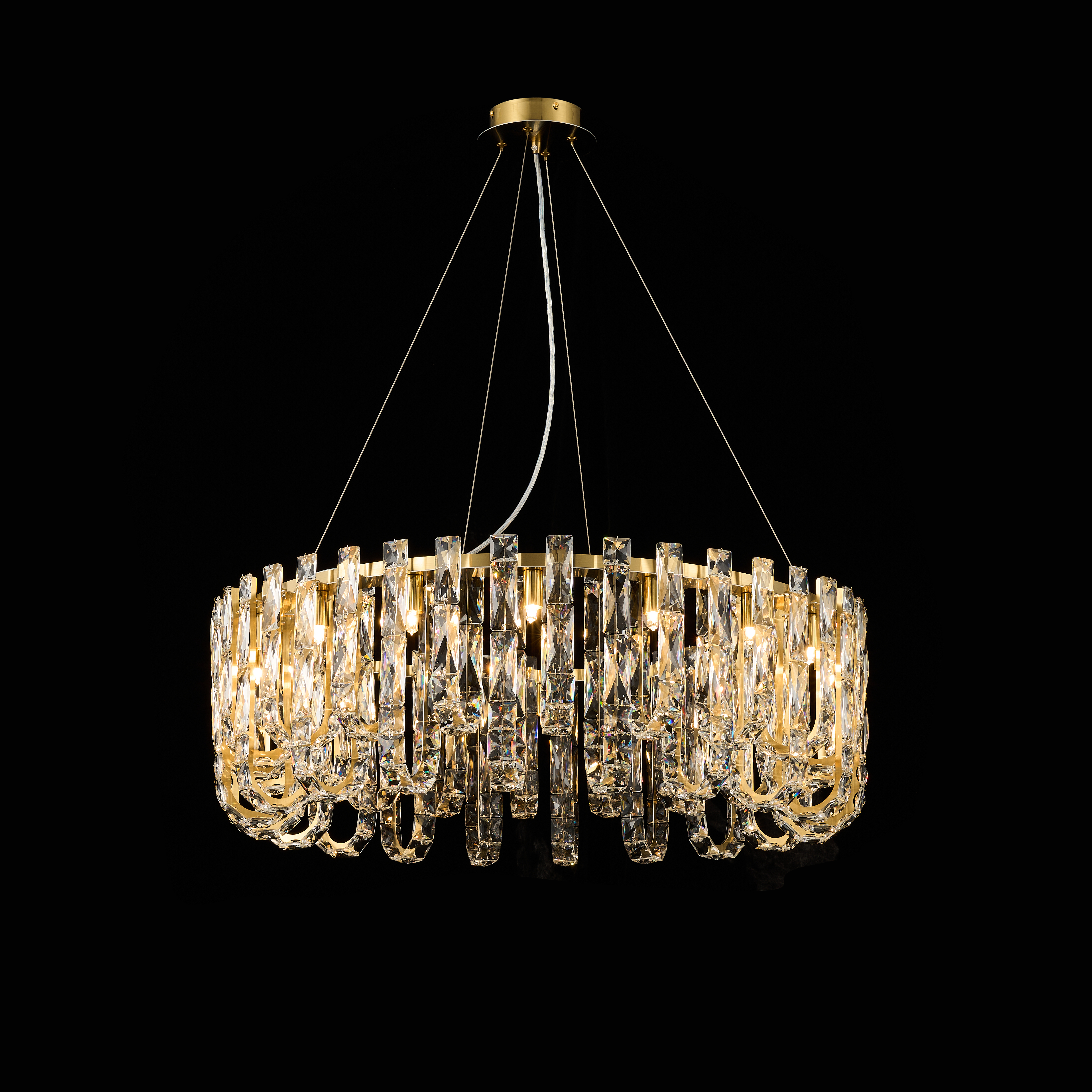 Коллекция Infinity включает в себя роскошные люстры и бра, золотой каркас которых украшен цепочками из скрепленных между собой пластин из прозрачного хрусталя высшего качества. Они крепятся к основанию с внешней и внутренней стороны и образуют арочки, которые создают эффект бликов и необычную игру света, что помогает подчеркнуть красоту и изысканность вашего интерьера.