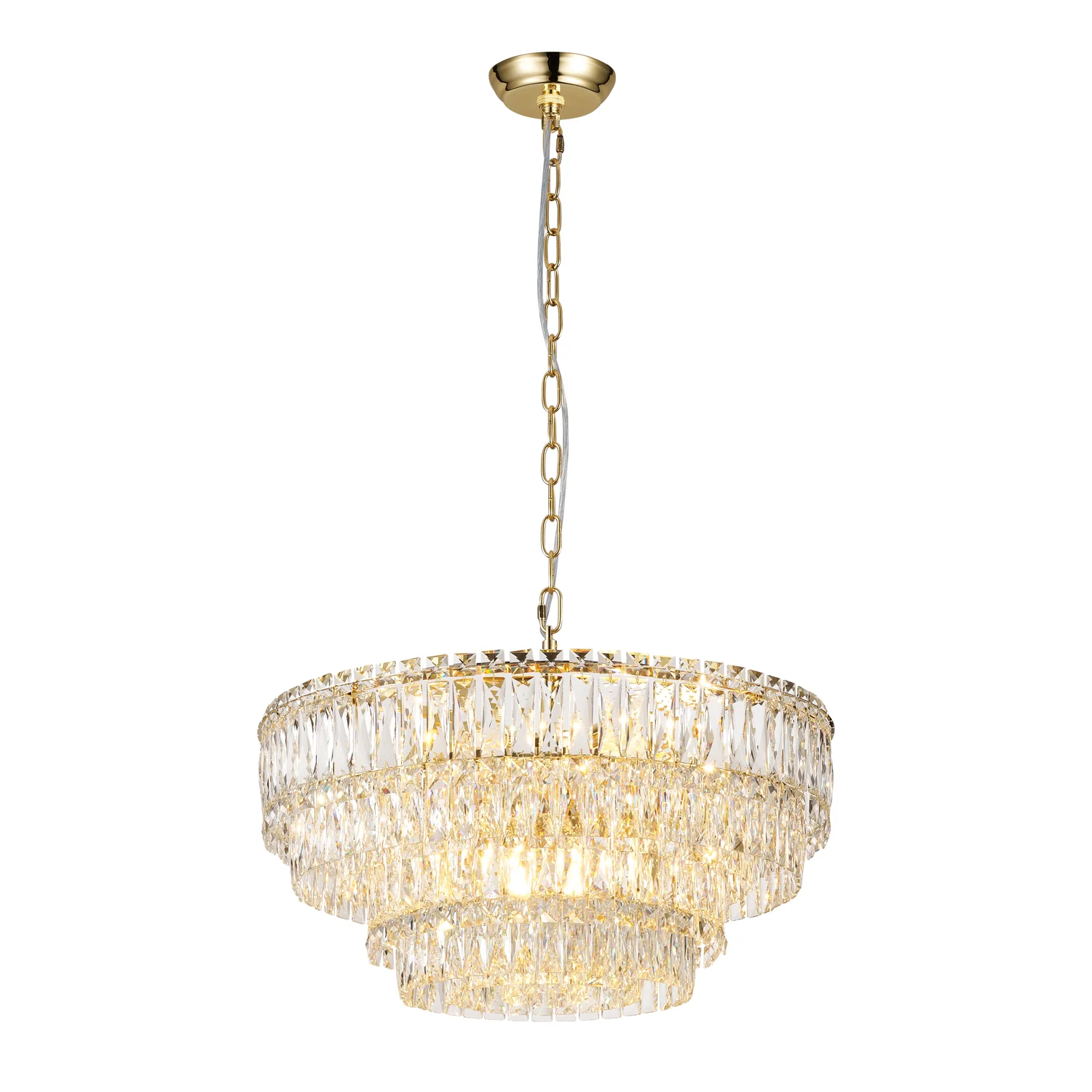 Коллекция Adamas — это воплощение роскоши и элегантности. Металлический каркас люстр с золотистым гальваническим покрытием полностью скрыт под обильным хрустальным декором. Изделия щедро украшены хрустальными элементами квадратной и прямоугольной формы, которые соединены в цепочки разной длины и образуют каскад. В коллекцию входят четыре модели диаметром от 500 до 1000 мм, а также бра, что позволяет украсить любое помещение дома или квартиры: от кухни до бального зала. Это делает коллекцию Adamas универсальным вариантом для интерьеров, в которые хочется привнести дух роскоши и богатства.