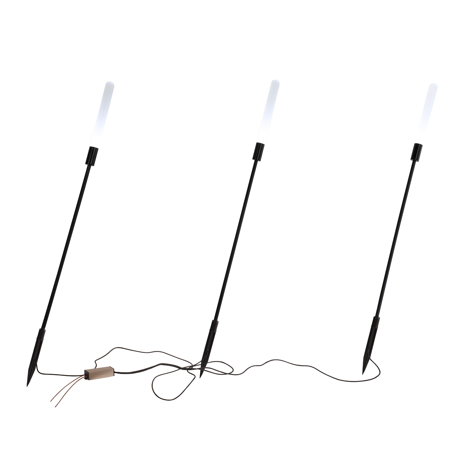 Дизайн светильников Reedy стилизован под стебли камыша, каркас черного цвета с заостренным наконечником оформлен плафонами из белого матового акрила, которые мягко рассеивают свет. Три светильника в комплекте позволяют сделать привлекательную экстерьерную композицию на садовопарковых территориях, длина провода между камышами составляет 1 метр.