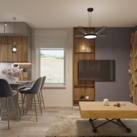 Современная и уютная комната наполняет радостью и теплом. Эффектный желтый диван и текстуры дерева в интерьере смотрятся стильно и благородно. Светильники Favourite коллекций Ripple (2310-2P) и Corruga (2186-1P) гармонично вписались в пространство.