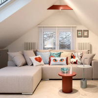В самой высокой части мансарды установлена сверхтонкая трековая система Unica с поворотными спотами. Благодаря возможности управления через приложение или умную колонку Алиса, можно выбирать яркость и температуру света, что делает нашу трековую систему универсальным источником света.