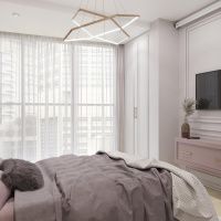 Нежные молочные оттенки в сочетании с пыльно-розовыми, обилие текстиля и мягких поверхностей – прекрасное место для сна и отдыха в проекте Ксении Суворовой и Ирышковой Елены. Современный LED светильник Favourite коллекции Hexagon (2103-14P) отлично дополняет интерьер благодаря своей необычной шестигранной форме и теплому золотому цвету.