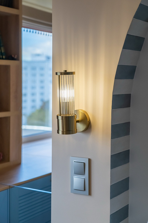 Песочные тона, глубокий синий, округлые арки и наш свет, который подчеркнул уют и выявил всю глубину дизайнерской палитры.