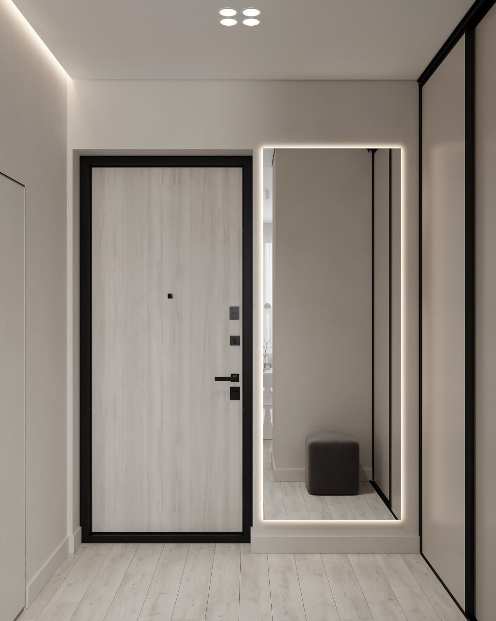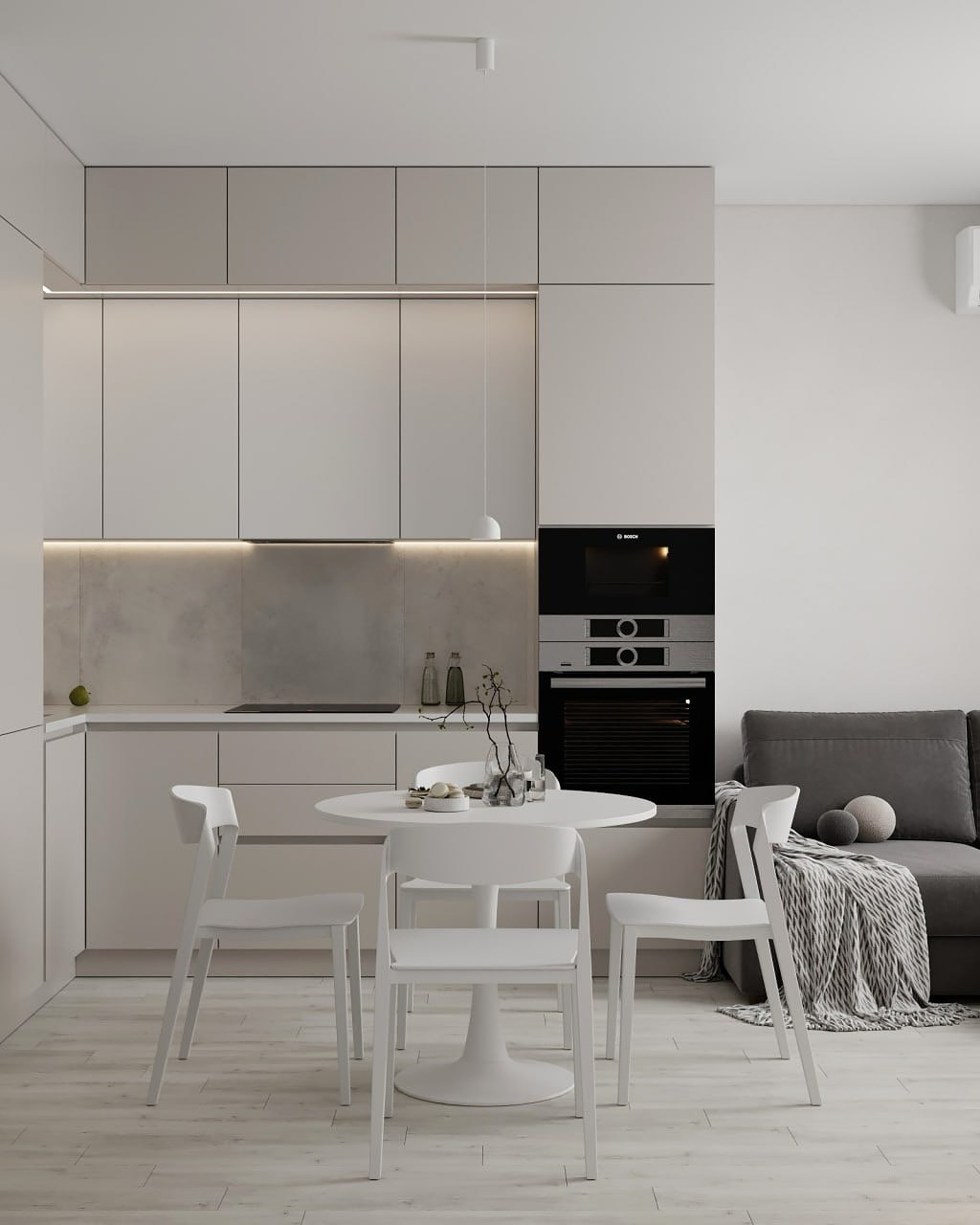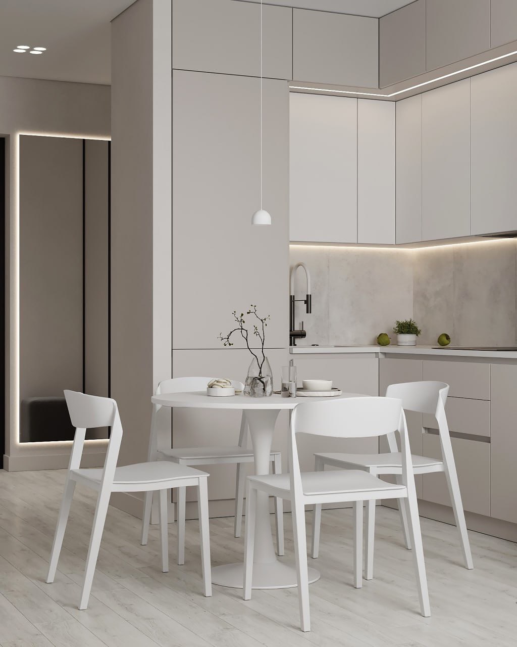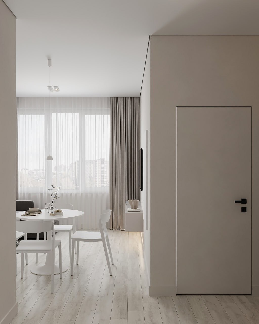 Минималистичный интерьер в светлых, ванильных оттенках который сочетает в себе функциональность и эстетику. Пространство, где главная идея дизайн студии — использовать нейтральные цвета с акцентами в виде оригинального освещения и картин, которые студия распишет для этой квартиры.